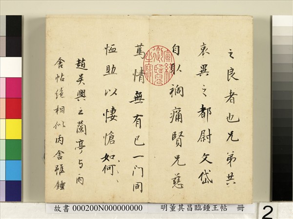 董其昌(西元一五五五-一六三六年),字玄宰,號思白,江蘇華亭人。書畫兼擅,其書風疏朗秀逸,自創一格,後世習者甚眾,行草為明代之冠。董其昌自十七歲學習書法以來,即有系統臨摹古人書蹟,終其一生無時不鑽研鍾王法帖。此冊為五十五歲所作,分別臨寫鍾繇〈力命表〉、〈墓田丙舍帖〉、〈戎路表〉、王羲之〈曹娥碑〉、王獻之〈洛神賦十三行〉等五段。董認為臨帖要參離合,不能太似或不似,此五段皆節臨,字句與原帖有出入,是掌握其精神的意臨。