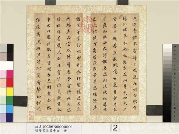 董其昌(西元一五五五-一六三六年),字玄宰,號思白,江蘇華亭人。萬曆十七年(一五八九)進士,官至禮部尚書,諡文敏。天才雋逸,善書畫,富收藏,尤精鑑賞。臨摹書蹟,至忘寢食。行楷之妙,稱絕一代。 本冊作於萬曆三十九年(一六一一),董氏時年五十七歲,自福建副使辭官已年餘,潛心藝事,書畫有成,「吾書因生而得秀色」一語即此期之自評。本冊參合智永虞顏之筆法字勢,蘊含自有之清朗疏秀風神,是董氏中期傑出之作。