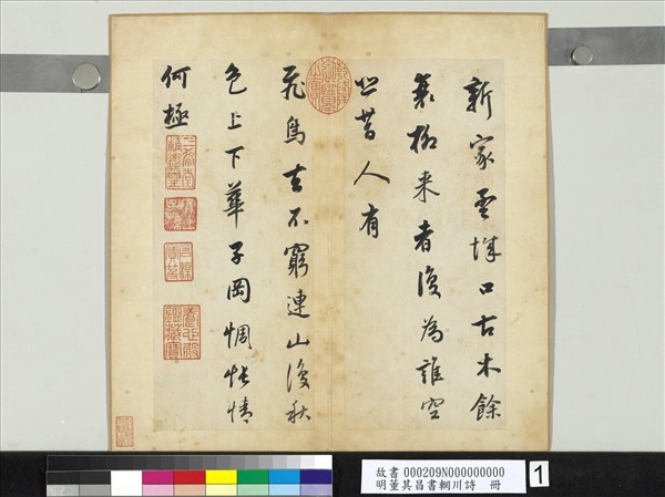 董其昌(西元一五五五—一六三六年)字玄宰,華亭(今上海)人,萬曆十六年進士,官至禮部尚書。明代後期書畫及鑑藏、評論家。長於楷、行、草書。「輞川詩」絕句二十首,是唐代詩人王維的一組詩作,歌詠輞川別業附近二十處勝景。董其昌此冊四十六歲書,用筆藏鋒裹鐵,十分含蓄。當時退職在家,或是將隱居遊樂的心情,投射在作為隱逸典型的「輞川詩」中。