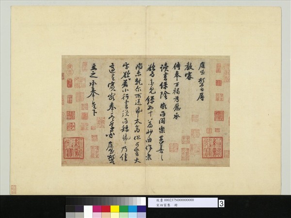 黃庭堅(西元一0四五-一一0五年),江西分寧人。字魯直,號涪翁。治平四年(一0六七)二十三歲進士,作過縣尉、校書郎、起居舍人、國史編修、知州等官。 他的書法初學周越,下筆沉著有法度,其後大字行書取法瘗鶴銘,草書師張旭、懷素,用筆頓挫起伏,結體傾側多姿,獨具面貌。本幅書尺牘一則,以圓筆藏鋒書之,勁健婉通,粘滯有力。本幅選自「宋四家集冊」。(20100102)