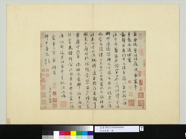 蔡襄(西元一0一二-一0六七年),字君謨,福建仙游人。與蘇軾、黃庭堅、米芾並列「北宋四家」,書法學虞世南、顏真卿,並取法晉人。其書風猶承唐人遺緒,以典重有法度為勝,譽滿書苑。 此行書尺牘,考其內容應寫於皇祐三年(一0五一),蔡襄時年四十,書風流利多媚態,似虞世南,不同於蔡氏存世書蹟中多承繼顏書沉穩遒勁。本件曾為項元汴所有,上有千字文第七七六「颻」字號。