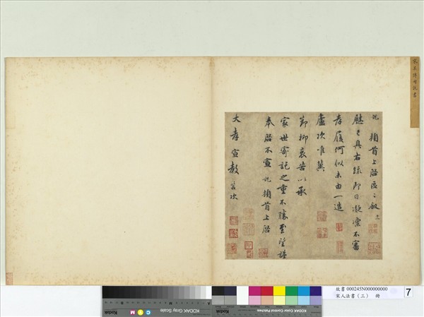 吳說,杭州錢塘人,字傅朋,號練塘。活動於宋高宗〈西元1127-1163〉時代。承其家學淵源,父親吳師禮也以此道名聞遐邇,在宋代書家紛紛求異趨奇之風潮中,吳說卓然以二王書風為宗師,平澹自如、不趨險絕,被許為宋代傳統書法的守護神。 本幅致大孝宣教尺牘,結構謹嚴,神韻雅秀。用筆或重或輕,字體或小或大,頗能發揮抑揚頓挫及牽絲帶絡之筆趣,世吳說晚期之佳作。 本幅為「宋人法書」第三冊第七開。
