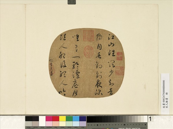 宋高宗曾親自教導孝宗(1127-1194)學習書法,此幅草書七言絕句,書於鸞鳳紋花綾上,書風與宋高宗相似。不過高宗書筆畫較豐腴,結字略扁闊,偶帶章草古意;此幅點畫偏於細勁,運筆圓轉流暢,字形稍瘦而高長,與高宗書有所差異。可能是孝宗親書,賜與身邊內侍之作。 宋孝宗喜好蘇軾詩文,常置於身邊誦讀或書寫。從此幅書詩小品及前人記載,可以看出孝宗在文藝方面的傾向。(20101015)