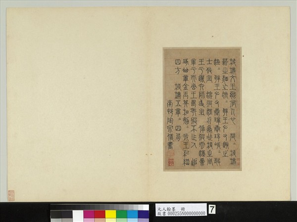 陶宗儀(1316-?)字九成,號南邨,浙江黃巖人。元末居松江地區,永樂元年(1403)仍在世。纂述豐富,至正二十七年(1367)序的《輟耕錄》收錄黃公望〈寫山水訣〉。〈寫山水訣〉對樹石、山脈、佈景、材質用色皆有講究,是黃公望傳授畫藝的法則依據。此篆書《詩經》〈棫樸〉,以中鋒圓勁線條為主,又有帶折角的方筆,形成圓勁中別具力道的獨特效果。此與趙孟頫等人勻淨線條不同,另有一種古樸趣味。(20110609)
