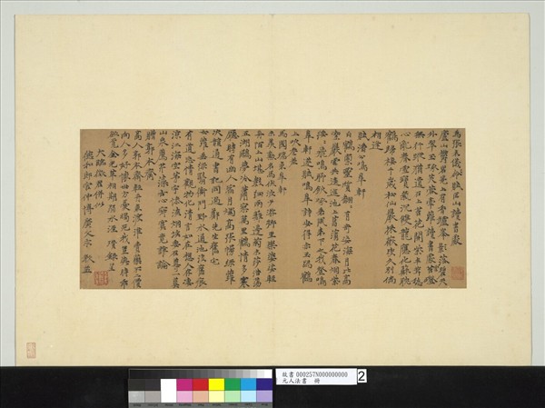 倪瓚(西元一三0一年-一三七四年),江蘇無錫人,字元鎮,號雲林,山水風格簡淡,為元四大家之一,他的書法則自成一體,奕奕有晉宋人風氣。元初的趙孟頫學晉唐,書風流美圓潤,而倪瓚則由三國魏鍾繇〈薦季直表〉入手,面貌高古冷逸,無一絲俗塵。本幅字體瘦勁,造型稍扁,但結字甚緊,筆畫尾端強調隸書的波磔動作,將隸書的趣味和張力與楷書結合,本幅為「元人法書」冊之二。