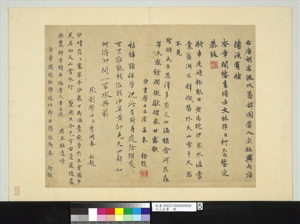 元文宗天曆二年(西元一三二八年),元文宗設奎章閣,從事漢籍翻譯與書畫收藏等文化活動,並任命柯九思為鑒書博士。此件即為當時奎章閣所收〈唐胡虔汲水蕃部圖〉跋尾,分別由柯九思、虞集、李泂、揭傒斯所書,由跋文中所書官銜,並四人遷轉來看,約寫於至順元年(一三三○)到至順二年間。又四人皆為元代中期重要文人及書法家,由此可見其各別書風,也是元文宗奎章閣鑒藏書畫的另一佐證。(20110101)