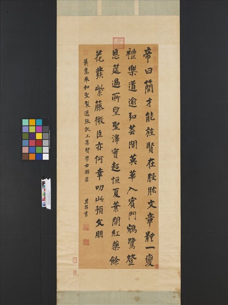 董其昌(西元一五五五?一六三六年)字玄宰,號思白,江蘇華亭人。萬曆十七年(西元一五八九年)進士,官至禮部尚書,諡文敏。天才雋逸,善書畫,富收藏,精鑑賞。行楷之妙,稱絕一代。本幅抄錄唐人蕭嵩詩,讚頌張說(西元六六七?七三Ο年)及唐代集賢院文風。此軸楷書用筆渾厚,結字靈動,承繼顏真卿(西元七Ο九?七八五年)楷書精神,但更講究用筆變化以及疏朗行氣,堪稱是董其昌在顏體中追求虛和取韻的自我面貌。(20100711)