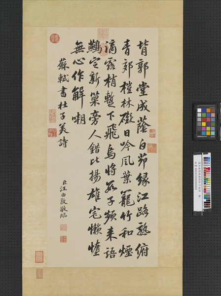 汪由敦(西元一六九二-一七五八年),字師苕,號謹堂,又號松泉居士,安徽休寧人。清雍正二年(一七二四)進士,為乾隆朝重要文臣。善書法,書風取法唐宋名家,兼工篆、隸。去世時,乾隆親臨祭奠,贈太子太師,謚文端。 蘇軾原蹟「書杜甫榿木詩」卷,現寄存本院,並入〈三希堂法帖〉,乃元豐四年(一○八一)蘇軾抄寫杜甫〈堂成〉詩而成。汪氏此書,雖曰臨寫,然行筆體勢,已為汪氏己貌。(20110101)