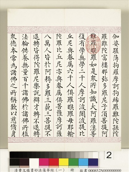 法華經可繁可簡,本幅以朱紅鉤繪靈山法會,人物僅繪釋迦牟尼佛、阿難、迦葉二羅漢及四大天王。  本幅為清曹文埴書﹝妙法蓮華經﹞卷一扉畫。