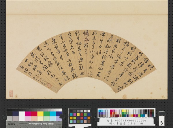 文徵明(西元一四七0-一五五九年),江蘇長洲人。字徵仲,號衡山居士。五十四歲以歲貢到北京,任翰林院待詔。他在詩文和書畫方面都有很高的造詣,是明代中葉蘇州書畫界的領袖。這幅行草詩書於八十二歲,詩中描述晚年閒居度歲,優游於田園之樂,書法兼有溫潤與勁銳,是晚年的典型。選自「明人書扇貞冊」。