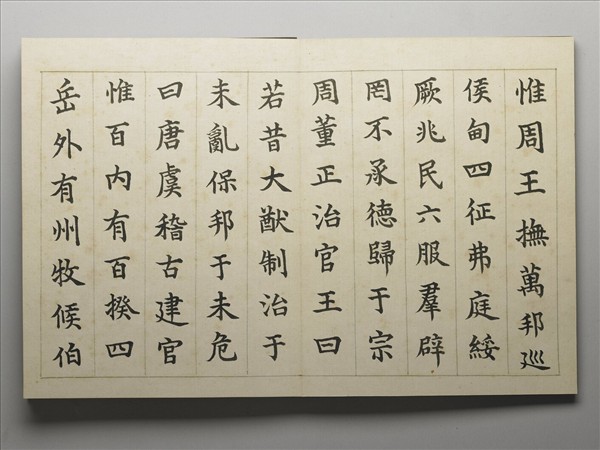 紙本冊頁,梵夾式,前後以木質裝幀,八開,單線烏絲欄。楷書,木質封面隸刻填金「御書周官」,內頁為嘉慶帝書《尚書.周書.周官》全文,字體端整嚴謹。款屬「嘉慶己未(四年,1799)仲冬上澣御筆」,下鈐「嘉」、「慶」朱白雙連章,後有朱珪(1731-1807)的跋與印。