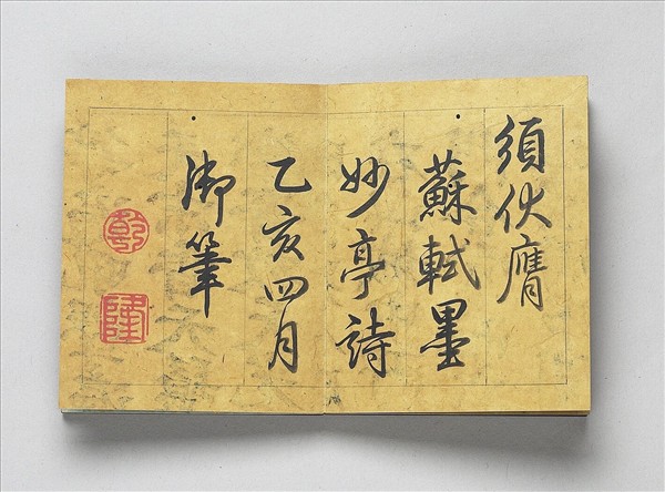 紙本冊頁,梵夾式,八開,前後空白各二開,單線烏絲欄。行楷書,為乾隆書寫蘇軾墨妙亭詩而成,筆致圓潤流動,結字外鼓而亭勻。款屬「乙亥(乾隆二十年,1755)四月御筆」,卷尾鈐「乾」、「隆」朱文雙連章,木質封面填金隸刻「御臨蘇軾墨妙亭詩」。本件與二件玉人(故玉2206-2207)、玉斧佩(故玉2208)同儲於有乾卦符號之木盒(故玉2206N1)中。