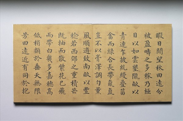 紙本冊頁,梵夾式,六開,前後空白各一開,木質封面有「戴衢亨書王棨多稼如雲賦」填金楷款,可知為清人戴衢亨抄寫王棨的文字。此外,紙上有「乾隆年仿金粟山藏經紙」印記,可知其用紙特別講究,「金粟山藏經紙」屢見於明代人書寫使用,而本冊用紙,正是乾隆朝追訪名紙製作而成。整冊以楷書寫就,字架寬和,用筆柔而秀,大抵是學習唐人楷法,並用柔美來緩和唐楷中的嚴峻之氣。末款署「臣戴衢亨敬書」,並鈐「臣」、「衢亨」朱白文雙連章,冊前空白處並有「嘉慶御覽之寶」朱文大印。戴衢亨(1755-1811)為乾隆時舉人,院藏戴氏畫作中,許多件上皆有嘉慶皇帝題詩,可知其主要的活動時間為乾嘉二朝。《清史稿》譽其謹飭清慎。