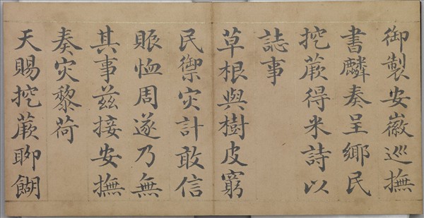 小冊頁,前後以木質裝幀,木質封面刻「降嘉記實」填金隸字。內頁金繪有界行,由彭元瑞(1731-1803)楷書清高宗詩作,由其詩註可知,其詩所記乃是災民掘土得米的異象,清高宗與其大臣認為這件事近於祥瑞,故作詩記之。冊頁與另一布套同置於漆盒中。