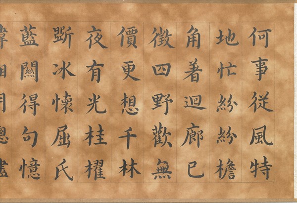 紙本小手卷,包首以朵花紋為地,楷字題簽「御製養心殿對雪喜成禁體詩。附臣工恭和」。內容一如題簽所述,為清宣宗於道光癸未年(1823)所作的對雪詩,以及與臣子曹振鏞、英和、黃鉞、祁寯藻、程恩澤等人和詩之作。清宣宗詩作為其親筆自書,架構端正、用筆豐澤,流露出唐代大書法家顏真卿的特色。至於臣工和作則由程恩澤(1785-1837) 抄寫其上,用筆輕處與重按處形成對比,略見瘦勁與剛強,字架端正,有唐人顏真卿、柳公權書風中骨架挺立之態。本卷與其他九件書畫同儲於漆盒中。