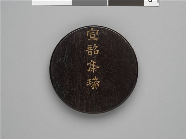 圓形圖冊,木製的封面上刻隸書填金「宣韶集瑞」四字。冊頁共七開,由第六開詩文末端楷書「御製乙未春帖子」及「臣王際華敬書」款得知,圖冊為內閣學士王際華(1717-1776)謄寫清乾隆乙未年(1775)皇帝御筆的春帖子而來。王氏並繪製歲朝圖敬呈。清宮的春帖子多為皇帝御筆,書寫於立春、端午和中秋等節日,內容為吉祥詩詞或話語,作為貼掛內廷的門扉或賞賜臣工。 畫冊為對開本,分別以左畫、右書的形式編排。