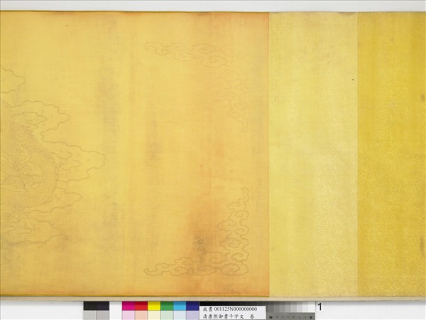 清聖祖名愛新覺羅•玄燁(西元一六五四-一七二二年),年號康熙(一六六一-一七二二),在位六十一年。聖祖平生勤於書藝,宗董其昌,師法趙孟頫、蘇軾、米芾、顏真卿,並上追晉人古法。本幅絹本臨米芾書千字文,於文末自述生平曾臨米芾書千字文數卷,乃以本卷賜保和殿大學士兼刑部尚書吳琠。拖尾有吳琠題跋,記述於康熙癸未(一七0三年)夏五月二十二日獲賜此卷。 (20121017)
