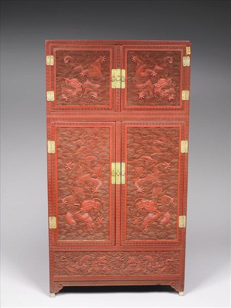 小櫃以雲龍紋作櫃門,側面作錦地,櫃內另有小屜,作為實用功能的小櫃,漆層變化多,長形面葉及合頁銅飾件講究,紅漆與金色相應,穩重華麗。