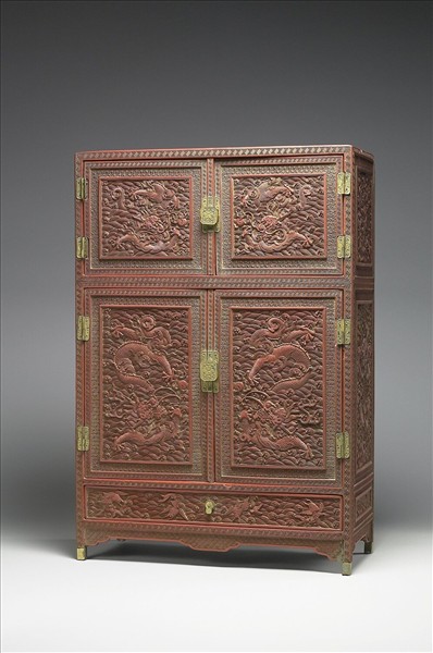 剔紅長方形立式小櫃,分三層,上與中層為對開式門,嵌銅軸片與飾件。櫃中層較大,中層內上方設有暗屜。下層作抽屜,底有四如意形足,櫃面、頂面與兩側有多個開光,皆雕龍戲珠紋,飾以波濤,外襯繡球朵花錦地,屜面雕波濤紋與魚龍。邊界均飾回紋,器裡與底髹黑色光漆。