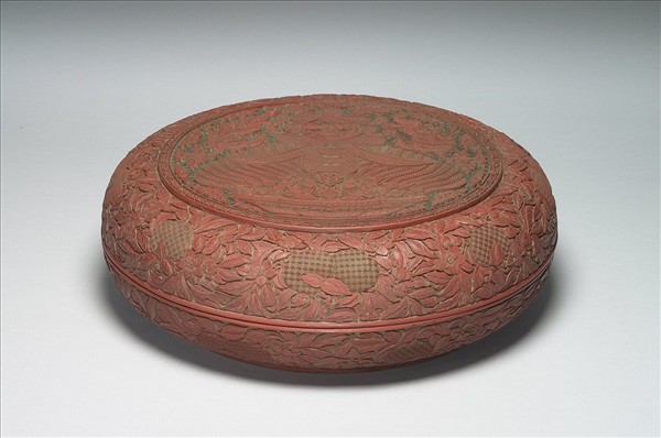 圓形蒸餅式漆盒,矮壁淺圈足,漆面為紅色,器之外壁與器蓋皆剔彩纏枝花與山水人物為飾,蓋面有圓形開光,開光中構圖乃雕一聚寶盆滿盛珍寶、放出毫光,中央並有雕一大「春」字,內有一壽星端坐,「春」字旁有雙龍峙列飛舞雲間,上述圖像,均剔彩雕就,皆見整器之優美與精雕細琢。