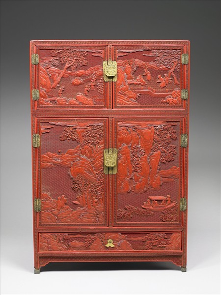 剔紅長方形小櫃,色硃紅,醇厚有光澤,邊角略有傷損。立式小櫃,分三層,上與中層為對開式門,中層較大層櫃上方設有空格,內有暗屜,下層作抽屜,底有四如意形足,嵌銅鎖、合頁與鈕頭。櫃面共有五個開光,以回紋為邊框,雕山林水泊間遊人景致,頂與二側面則飾繡球朵花錦地。櫃裡與背髹黑色光漆。