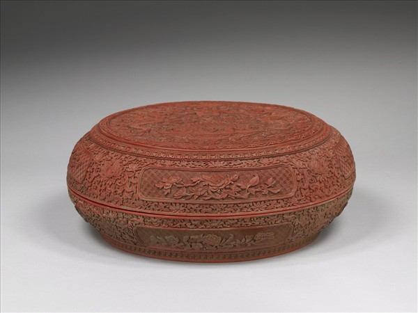 剔紅,圓盒,面雕雲龍及聚寶盆,上有一「春」字,字之中央雕一壽星。四周以番蓮為地,開光處雕花卉,襯以錦地。底裡均漆黑光,蓋內雕「壽春寶盒」四字,底有「大清乾隆年製」楷款。