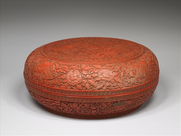 盒底及盒內髹黑漆。圓盒側面作鳳凰牡丹紋,一鳳一凰隔牡丹相對,共兩組,盒蓋亦同,中間一朵牡丹,外圍鳳、凰之間各一朵花朵,枝葉蔓生,佈滿面盒,分佈平均,紅色錦地之上再飾紋飾,喜氣端莊,口沿及圓周以回折紋帶狀區隔。紋飾協調,雕工細膩。