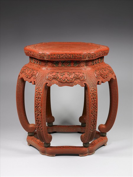 雕漆圓凳,凳面作六瓣葵瓣式,束腰,壺門圈口,六鼓形腿,下雕圓珠接托泥,六龜足。木胎,髹深綠紅色漆,凳面以正面朵花為中心,向外對稱飾番蓮花、盤長結、蝙蝠與拐子龍等,外圍雕紅綠漆纏枝蓮,器側各有飾卷葉紋雲形開光,腿柱與托泥面則飾拐子龍與花卉。底面髹黑色漆。