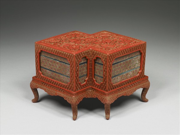 以兩個菱形重疊一角組合而成的方勝形盒,分成底、內盒及盒蓋,底有六足,蓋側開光,內盒為二層套盒,盒內兩磬形盒及十字形小盒。蓋面以蟠雲紋為地,中央一花形,兩側為盤長、傘蓋、雙魚等八寶,飄揚的飾帶與底層捲動的雲紋,富於動感。盒底面上邊緣陰刻花葉,中央刻雙蝠。盒側、及足飾六角形錦地,盒面及開光加框,底側足間作如意形飾。內盒為黑漆及黑漆地彩漆番蓮紋,側面及盒面六角龜甲形幾何紋。設計古雅,做工精緻。