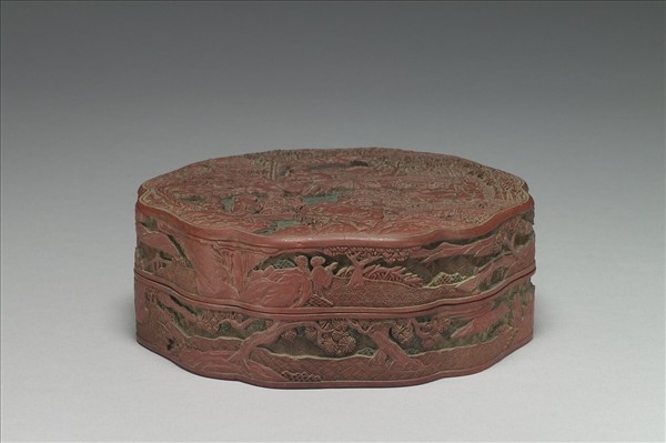 似木胎,盒作六瓣形。口壁垂直,矮壁,平底。漆為紅、綠、椶三色。蓋面雕竹林七賢圖。竹林中二人席地展卷,右下方二人於石案對奕,側有一人聚神立觀;左下方橋上行人一,後有一童負物相隨。襯以松石流雲、小橋溪流、山花芳草。並飾回紋、水波、萬字朵花等錦地。蓋、器周壁均雕人物、山水橋樹、流雲等物事,並飾水波、朵花、古錢等錦地。盒底及器裏均漆黑光。