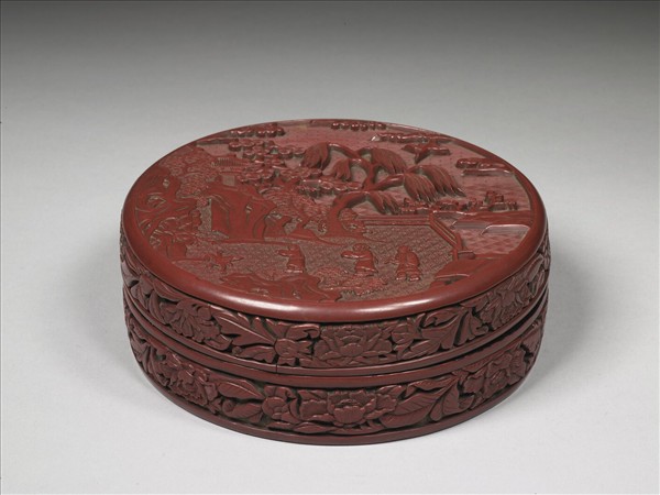 蔗段式盒,子母口,圈足,底部及盒內髹黑漆。盒面為庭園人物圖。畫面以欄杆區隔出前景,左側奇石聳立,林木茂密,石後一樓閣,一人半開門而出,柳樹立於畫面中央,樹下二人、一童子面對著一隻回首張翅的鶴,呼應著柳樹梢自天空俯衝而下的另一隻鶴。畫面漆層明顯分為二層,底層為錦地紋,包含中景的水波紋,和遠景的回紋,是承襲十五世紀以來的作法。底層之上為山石人物樹木,表面刻劃石頭紋理、樹葉形態等,刻痕淺,物象平板,尤其畫面右側石頭的造型重覆,柳樹長葉的結組固定,雲紋亦規格化,與明初風格迴異。盒側為轉枝花卉,茶花、牡丹、菊花、梔子花,兩兩成組,枝葉作波浪狀,雖承永樂風格,然花朵下方擠入枝葉,花形亦大為不同。綜合略顯拙鈍的用工與漆層層次的處理,當為晚明風格。