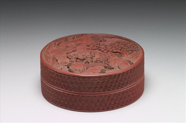 似木胎,盒作圓形。口壁垂直,矮壁,平底。漆為紅色,蓋面雕人物山水。有樵者二人,年少者雙手捧物行於前,年長者負薪於後,羣峯縱橫,水面平靜,襯以山花芳草,雜樹流雲;並飾回紋、水波、古錢等錦地。蓋、器周壁,均滿雕朵花錦地。盒底及器裏均漆黑光。