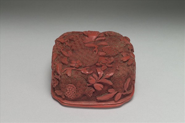 似木胎,盒作四瓣形,罩蓋式。口壁垂直,深壁,平底。漆色紅,蓋面及壁滿雕折枝石榴花果,結實九個,並飾回紋錦地。果上分飾朵花錦地。器壁光素,器底淺刻折枝石榴花果。周邊亦淺刻轉枝葉紋。器裏均漆黑光。無款識。有傷缺。