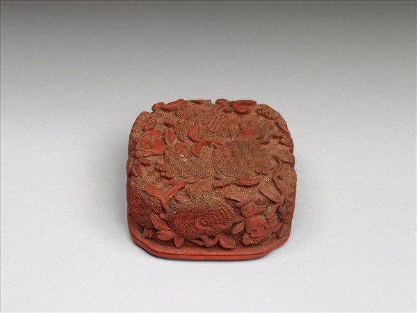 似木胎,盒作四瓣形,罩蓋式。口壁垂直,深壁,平底。漆色紅,蓋面及壁滿雕折枝石榴花果,結實九個,並飾回紋錦地。果上分飾朵花錦地。器壁光素,器底淺刻折枝石榴花果。周邊亦淺刻轉枝葉紋。器裏均漆黑光。