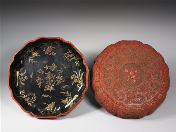 剔紅圓盒,色硃紅光豔。八瓣式圓盒,子母口,弧形壁、圈足。蓋面以蟠桃為中心,外圍有右旋內捲雲形帶紋八道,空隙填飾番蓮紋,側面滿雕雲紋,中有啣八寶之仙鶴,蓋身則飾雲紋與八寶。器裡與底髹黑色光漆,描金漆花卉、蟠桃與蝙蝠。
