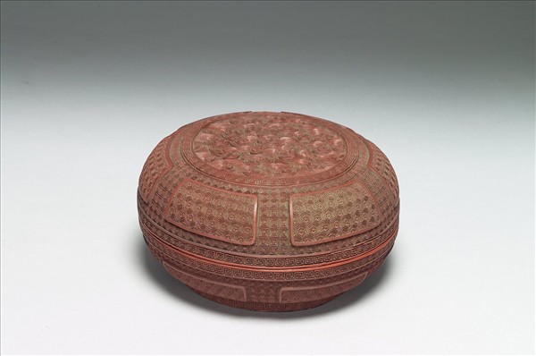 圓形蒸餅式漆盒,矮壁淺圈足,漆面為紅色。器之外壁蓋與盒身計有十二個梯形開光,開光內皆雕六角錦紋。蓋面以回紋圍出圓形開光,開光中構圖雕蟠雲紋。開光外,皆覆卍字形錦地紋。蓋內有「蟠雲寶盒」楷款,足內有「大清乾隆年製」楷款。
