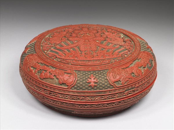 圓形蒸餅式漆盒,矮壁淺圈足,漆面為紅色,器之外壁與器蓋皆剔彩纏枝花與山水人物為飾,蓋面有圓形開光,開光中構圖乃雕一聚寶盆滿盛珍寶、放出光芒,中央並有雕一大「春」字,內有一壽星端坐,「春」字旁有雙龍峙列飛舞雲間,上述圖像,均剔彩雕就,特其光芒三色交替呈現,又以別樣漆色襯之,皆見整器之優美與精雕細琢。器底有「大清乾隆年製」楷款。