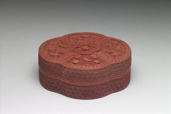 剔紅菱花形盒,色紅。橢圓形四瓣,子母口,直壁,平底。蓋面以波濤紋為地,雕飾梅花沉浮其中,四個刻回紋雲鉤相扣為邊,蓋與器側面飾繡球朵花錦地。器內髹黑色光漆。