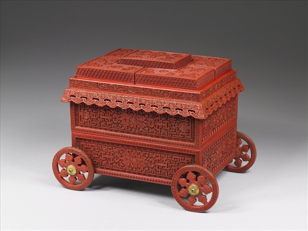剔紅套盒,色硃紅光艷。長方形盒作四輪輦形,雙層套盒,蓋上尚有五小盒,下有四輪。盒側面滿雕番蓮花,蓋面以朵花錦地飾團花。器裡均髹黑色光漆。