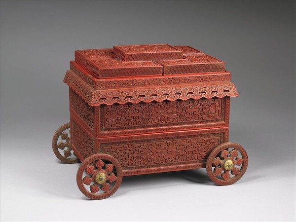 剔紅套盒,色硃紅。長方形盒作四輪輦形,雙層套盒,蓋上尚有五小盒,下有四輪。盒側面滿雕番蓮花,蓋面以朵花錦地飾團花。器裡均髹黑色光漆。