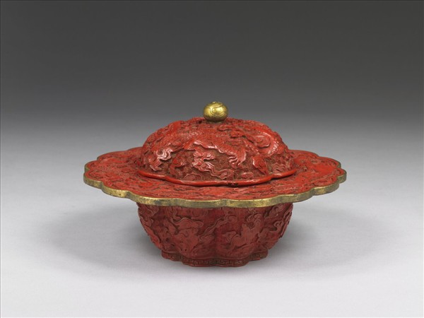 剔紅,色硃紅光潤。器作八瓣形,侈口,十六瓣包金屬沿平折寬唇,深壁,平底,蓋作穹頂式,頂嵌金屬球鈕。全器滿飾雲紋,蓋與盤狀口上雕戲珠龍紋,蓋鈕恰作龍珠,器腹則雕蝙蝠。盒底與器裡髹黑色光漆。
