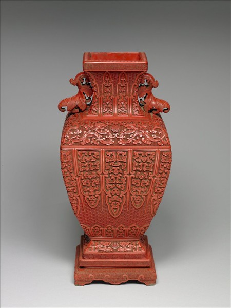 剔紅花瓶,色硃紅,明豔有光澤。方形瓶,撇口,收頸,豐肩,雙捲葉耳,碩腹向下斂收,圈足,足下連雲式八足几。全器刻三角形紋錦地,肩部每面雕對龍,身形修長流利,中有團壽字,肩上下對稱飾變形蕉葉紋,內雕小獸,圈足上飾拐子龍與回紋,下連小几則飾六角形朵花紋錦地。