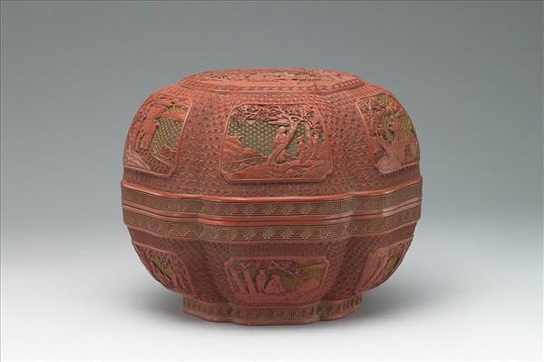 雕漆圓盒,通體雕紅、黃色漆,器身略有傷損。器作六瓣菱花形,子母口,弧形壁,圈足。蓋面雕山林間隱逸高士讌飲暢談,蓋與器側面各有六個開光,分雕林間隱人,或清談或閑步、或對月吟詠、或振筆題字,姿態各異但恬淡自適,餘地飾繡球朵花錦地紋。器裡與底髹黑色光漆,蓋內有填金楷款「集仙寶盒」,底則書「大清乾隆年製」。