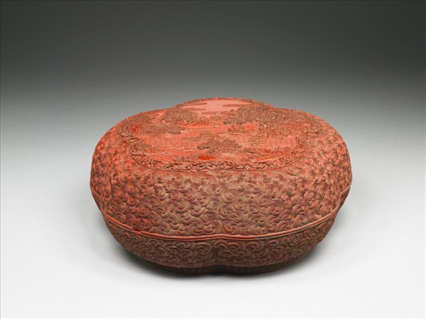 剔紅圓盒,色硃紅,明艷有光澤。器作五瓣梅花式圓盒,子母口,弧形壁,圈足。全器雕滿波濤紋,疊疊相重,緊湊富層次,蓋面以牡丹、蝙蝠、桃實等福壽吉徵作界邊,開光內雕坡石山林間,二老者臨水飲茶闊談。器裡與底髹黑色光漆,蓋內有填金楷款「仙儔寶盒」,底則書「大清乾隆年製」。