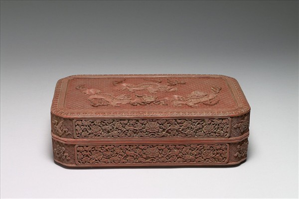 剔紅盒,色硃紅。長方形盒,四角收圓弧,子母口,直壁,圈足。蓋面以繡球朵花錦為地,上雕三獅戲球,獅圓睛長髮,身周有火焰紋,蓋與器側面各有四個開光,內飾番蓮花,餘地以斜方朵花為地分刻八吉祥。器裡與底髹黑色光漆,蓋內有填金楷款「馴獅寶盒」,底則書「大清乾隆年製」。