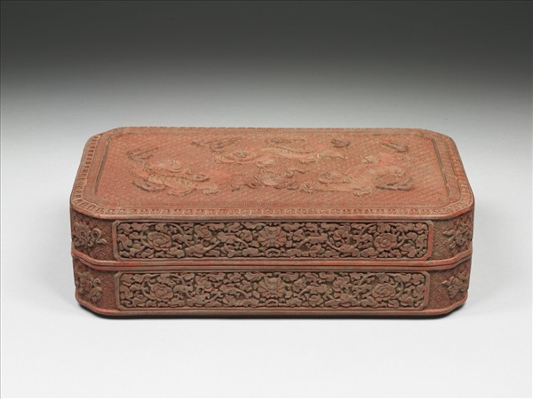 剔紅盒,色硃紅。長方形盒,四角收圓弧,子母口,直壁,圈足。蓋面以繡球朵花錦為地,上雕三獅戲球,獅圓睛長髮,身周有火焰紋,蓋與器側面各有四個開光,內飾番蓮花,餘地以斜方朵花為地分刻八吉祥。器裡與底髹黑色光漆,蓋內有填金楷款「馴獅寶盒」,底則書「大清乾隆年製」。