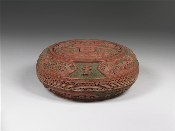 雕漆圓盒,通體雕紅、綠、黃色漆,口緣有小傷缺。子母口,弧形壁,圈足。器面雕盛滿珍寶之聚寶盆,其上放多色毫光,現一「春」字,中有南極仙翁,左右並有對龍,器與蓋側面各有四個開光,分雕山水人物,餘以斜方卍字錦地,飾雜寶多樣。器裡與底髹黑色光漆,蓋內有填金楷款「壽春寶盒」,底內則書「大清乾隆年製」。