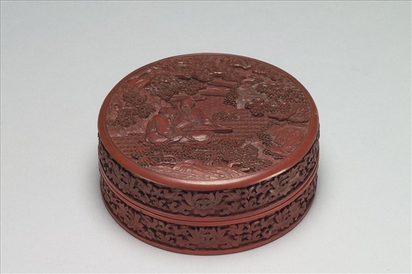 剔紅小盒,色磚紅,濃艷有光澤。子母口,淺直壁,平底內凹。蓋面雕松林之下,二老者席地而坐,撫琴歡談,器與蓋側面雕滿番蓮花葉。器裡與底髹黑色光漆,蓋內有填金楷款「琴德寶盒」,底則書「大清乾隆年製」。