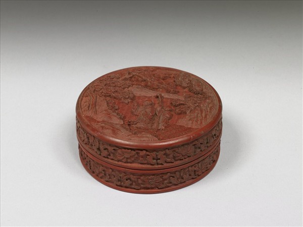 剔紅小盒,色磚紅,濃艷有光澤。子母口,淺直壁,平底內凹。蓋面雕松林之下,老者攜童閑步其中,器與蓋側面雕滿番蓮花葉。器裡與底髹黑色光漆,蓋內有填金楷款「友松寶盒」,底則書「大清乾隆年製」。