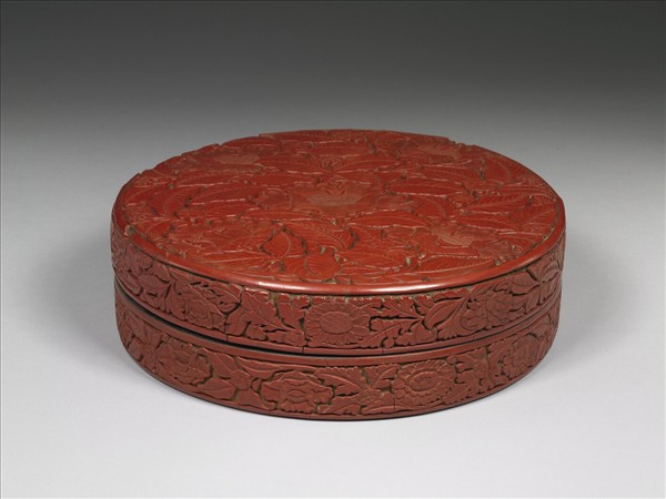 剔紅圓盒,朱漆黃素地,鮮艷有光澤,漆層略有剝損。子母口,淺直壁,平底。全器雕飾多種連枝花卉,花瓣枝葉舒捲自然,層次豐富嚴謹。器裡與底髹黑色光漆,底面邊側有直書刀刻填金楷書「大明宣德年製」。